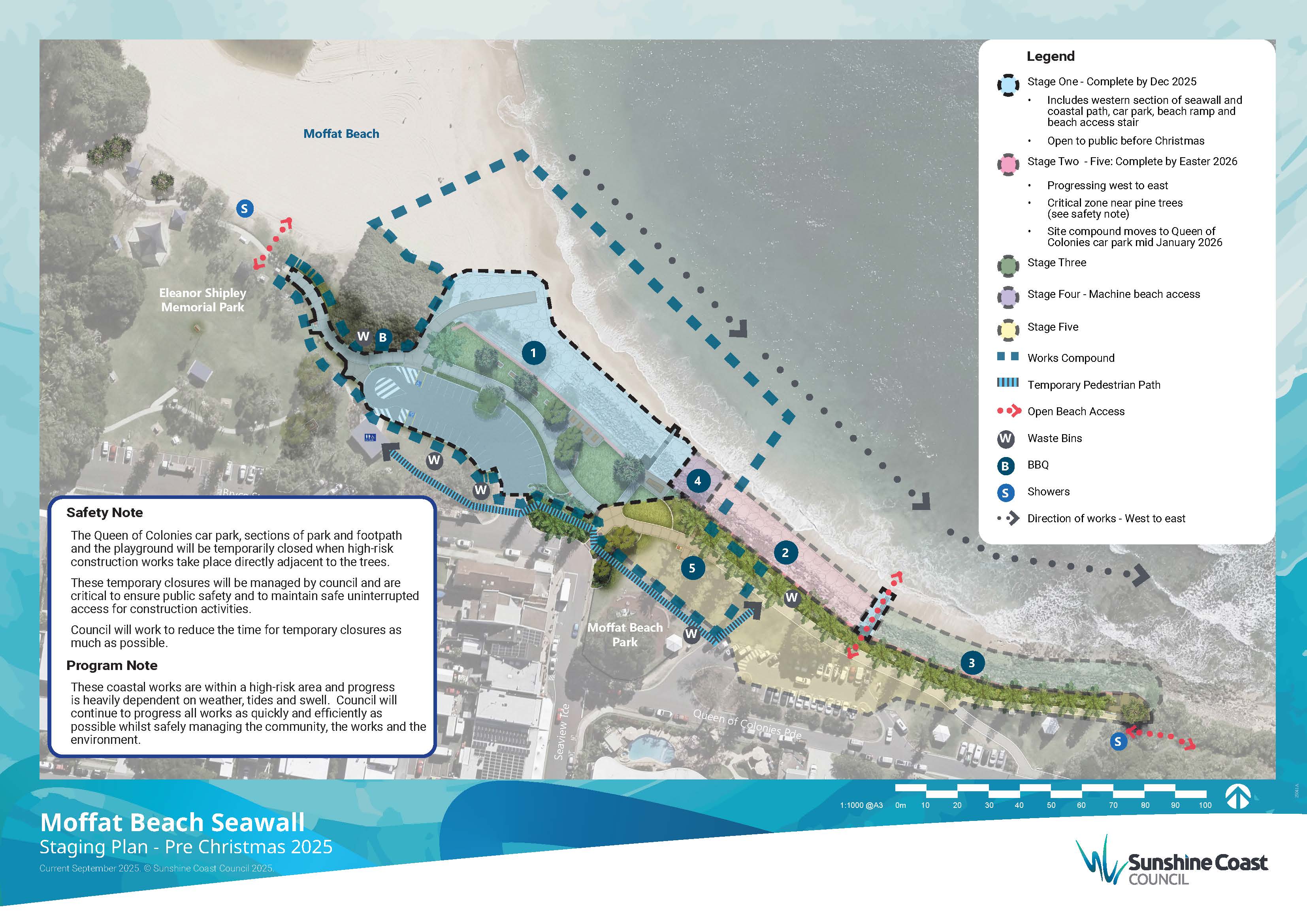 Moffat Beach Seawall staging plan: pre-Christmas 2025